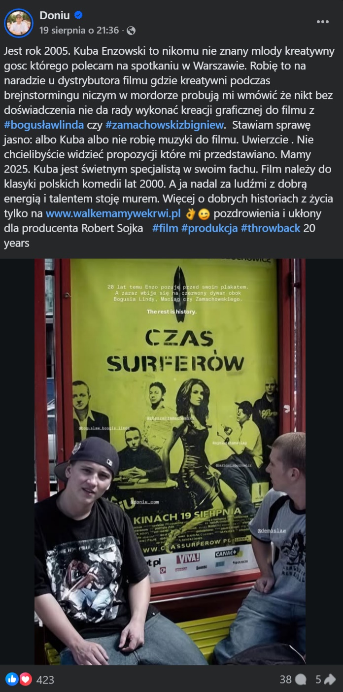 – Jest rok 2005. Kuba Enzowski to nikomu nie znany młody kreatywny gość, którego polecam na spotkaniu w Warszawie. Robię to na naradzie u dystrybutora filmu, gdzie kreatywni podczas brejnstormingu niczym w mordorze próbują mi wmówić, że nikt bez doświadczenia nie da rady wykonać kreacji graficznej do filmu z #bogusławlinda czy #zamachowskizbigniew. Stawiam sprawę jasno: albo Kuba albo nie robię muzyki do filmu. Uwierzcie. Nie chcielibyście widzieć propozycji, które mi przedstawiano. Mamy 2025. Kuba jest świetnym specjalistą w swoim fachu. Film należy do klasyki polskich komedii lat 2000. A ja nadal za ludźmi z dobrą energią i talentem stoję murem – napisał Doniu z okazji 20-lecia filmu.