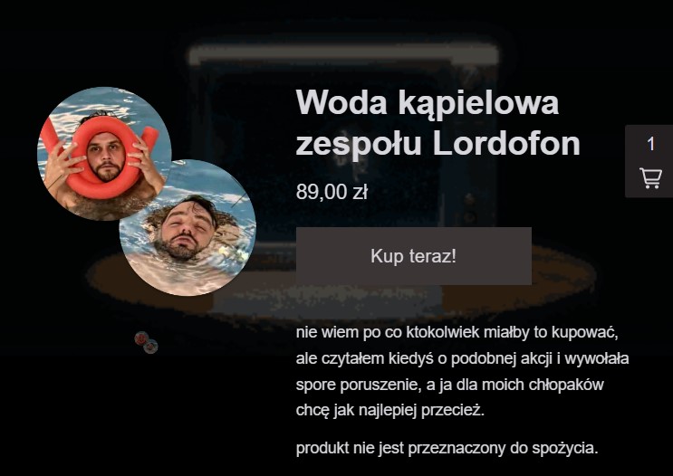 Duet oferuje także… wodę kąpielową zespołu Lordofon. Brzmi absurdalnie i tego typu oferta wydaje się być właśnie tylko po to, żeby wywołać emocję, ale produkt ten bez problemu również dodacie do koszyka.