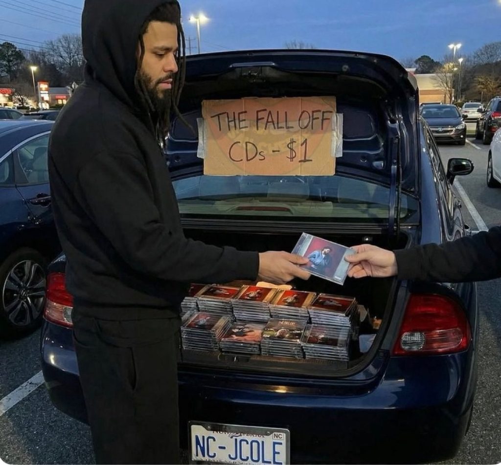 J. Cole od lat pokazuje, że nie odcina się od słuchaczy. Przy okazji premiery „The Fall-Off” zapowiedział coś więcej niż standardową promocję. Po pojawieniu się na odsłuchu w swoim rodzinnym Fayetteville w Karolinie Północnej ogłosił, że będzie sprzedawał fizyczne wydania płyty prosto z bagażnika swojego auta.