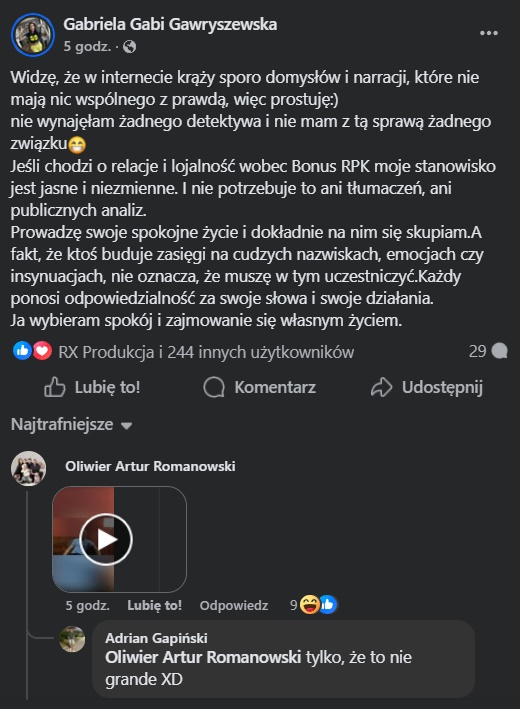 – Widzę, że w internecie krąży sporo domysłów i narracji, które nie mają nic wspólnego z prawdą, więc prostuję. Nie wynajęłam żadnego detektywa i nie mam z tą sprawą żadnego związku. Jeśli chodzi o relacje i lojalność wobec Bonus RPK moje stanowisko jest jasne i niezmienne. I nie potrzebuje to ani tłumaczeń, ani publicznych analiz – napisała.
