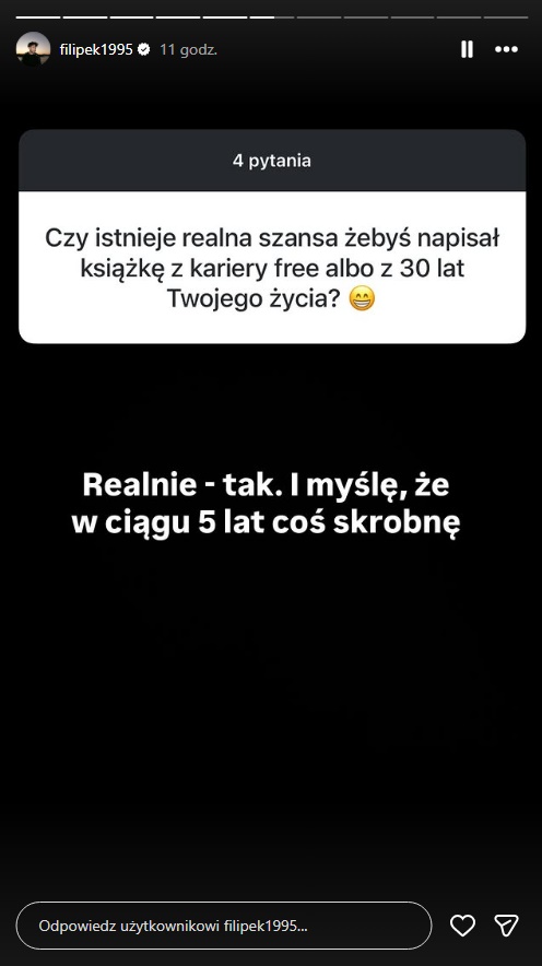 Ponadto dowiedzieliśmy się, że Filipek ma zamiar w przyszłości napisać książkę. – Myślę, że w ciągu 5 lat coś skrobnę.