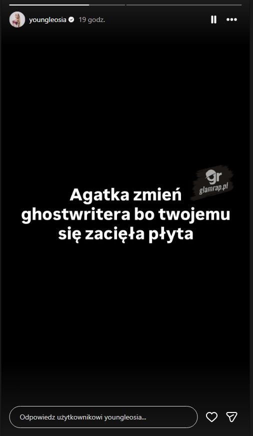 Young Leosia jasno dała do zrozumienia, że beef z Fagatą będzie miał kolejną odsłonę. W swoich mediach społecznościowych wbiła szpilę influencerce, pisząc: „Agatka, zmień ghostwritera, bo twojemu płyta się zacięła”. To komentarz do drugiego dissu „Dzień dobry”.