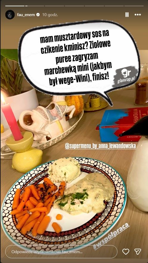 – Mam musztardowy sos na ćzikenie kminisz? Ziołowe puree zagryzam marchewką mini (jakbym był wege-Wini), finisz!