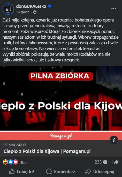 Kolejna rocznica agresji rosyjskiej w Ukrainę to bardzo ważny dzień w kalendarzu obozu lewicowego. Jeden z najbardziej rozpoznawalnych przedstawicieli tego środowiska na scenie rapowej, Gural, postanowił z tej okazji zaatakować przeciwników finansowego wspierania Ukrainy.