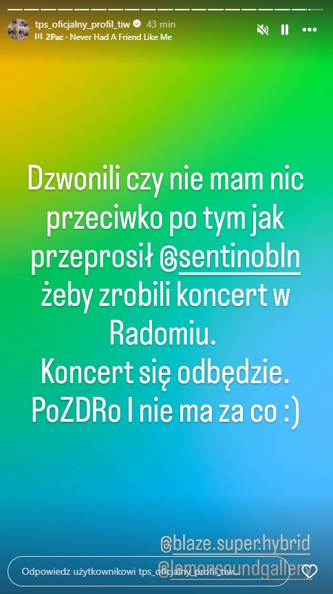 Przed chwilą TPS poinformował na Instastories, że miał telefon w sprawie koncertu Sentino, który chciałby zagrać w Radomiu.