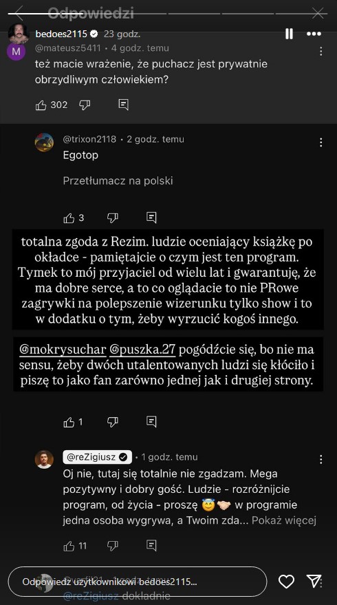 – Oj nie, tutaj się totalnie nie zgadzam. Mega pozytywny i dobry gość. Ludzie – rozróżnijcie program od życia – proszę – skomentował Rezi.
