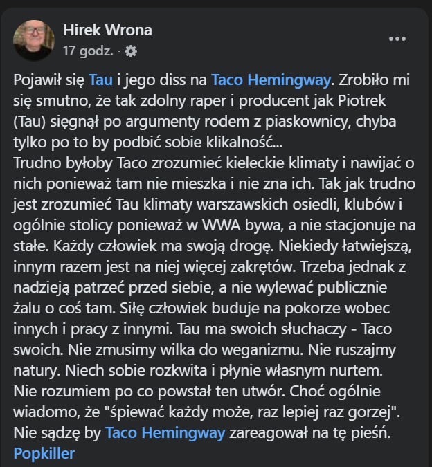 – Pojawił się Tau i jego diss na Taco Hemingway. Zrobiło mi się smutno, że tak zdolny raper i producent jak Piotrek (Tau) sięgnął po argumenty rodem z piaskownicy, chyba tylko po to by podbić sobie klikalność… Trudno byłoby Taco zrozumieć kieleckie klimaty i nawijać o nich ponieważ tam nie mieszka i nie zna ich. Tak jak trudno jest zrozumieć Tau klimaty warszawskich osiedli, klubów i ogólnie stolicy ponieważ w WWA bywa, a nie stacjonuje na stałe. Każdy człowiek ma swoją drogę. Niekiedy łatwiejszą, innym razem jest na niej więcej zakrętów. Trzeba jednak z nadzieją patrzeć przed siebie, a nie wylewać publicznie żalu o coś tam. Siłę człowiek buduje na pokorze wobec innych i pracy z innymi. Tau ma swoich słuchaczy – Taco swoich. Nie zmusimy wilka do weganizmu. Nie ruszajmy natury. Niech sobie rozkwita i płynie własnym nurtem. Nie rozumiem po co powstał ten utwór. Choć ogólnie wiadomo, że „śpiewać każdy może, raz lepiej raz gorzej”. Nie sądzę by Taco Hemingway zareagował na tę pieśń – napisał dziennikarz.