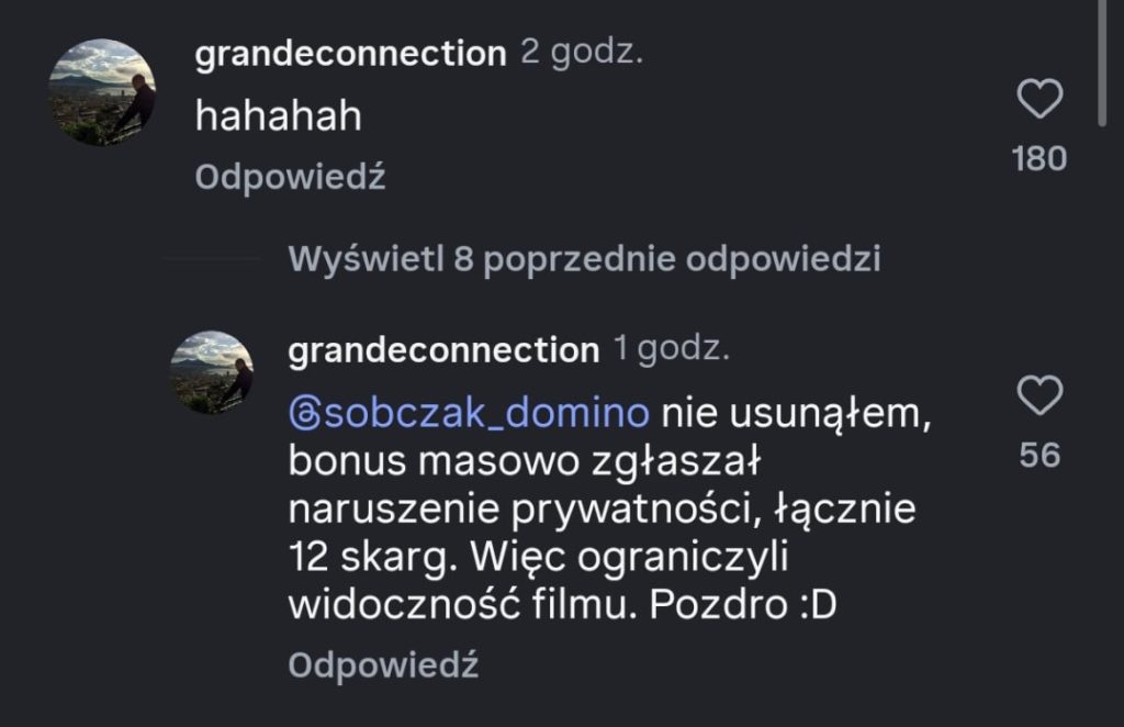 – Nie usunąłem, Bonus masowo zgłaszał naruszenie prywatności, łącznie 12 skarg. Więc ograniczyli widoczność filmu – ujawnił Youtuber.