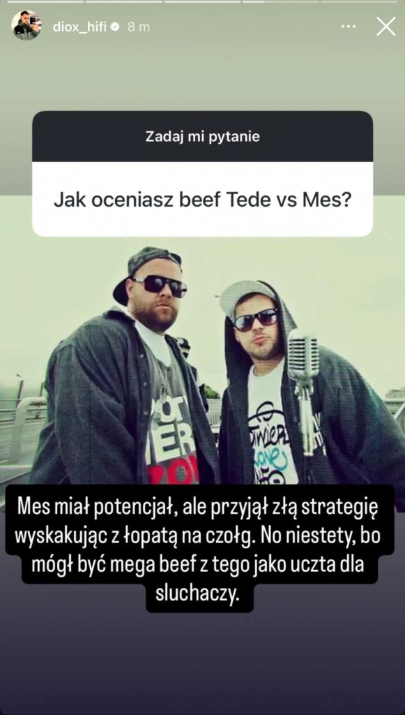 Diox zabrał głos w sprawie jednego z najgłośniejszych rapowych konfliktów ostatnich miesięcy – starcia Tede z Mesem. W trakcie instagramowego Q&A odpowiadał na pytania fanów, w tym dotyczące swojego spojrzenia na ten beef.