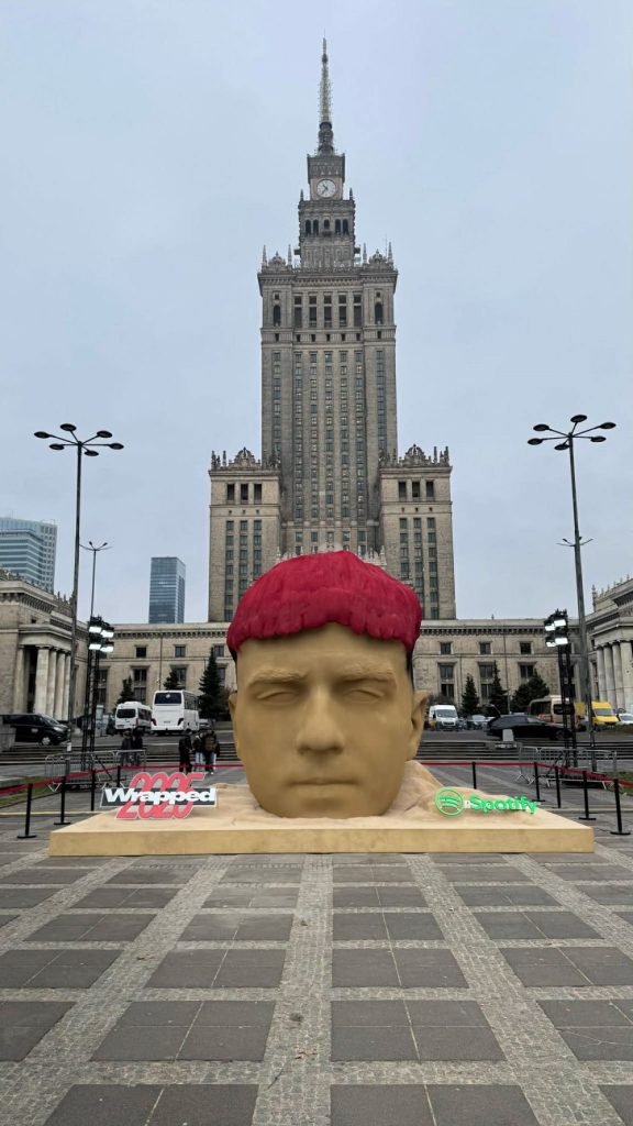 Przy Pałacu Kultury i Nauki w Warszawie powstaje monumentalna głowa Maty z czerwonymi włosami. Ma to związek ze Spotify Wrapped 2025.