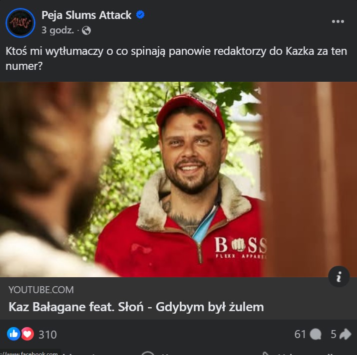 – Ktoś mi wytłumaczy o co spinają panowie redaktorzy do Kazka za ten numer? – zapytał poznaniak. Peja wdał się w komentarzach dyskusję z fanami, w której stwierdził, ż nie odbiera tego numeru jak śmianie się z bezdomności i spropsował zwrotkę Słonia.