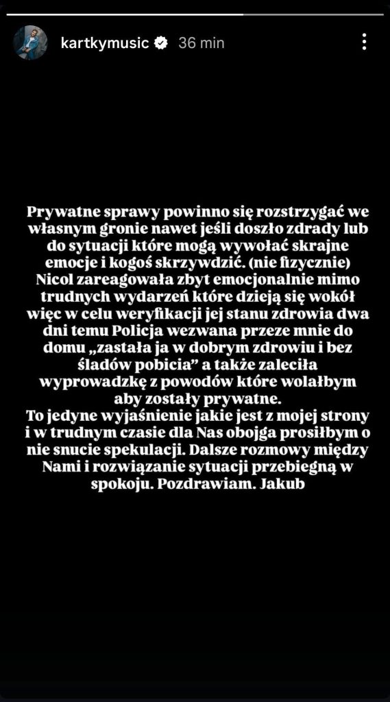 Kartky przerwał milczenie i wydał krótkie oświadczenie dotyczące głośnej sytuacji z Nicol Ślusarz. Raper podkreśla, że to kwestia prywatna i prosi o spokój. Wspomniał też o interwencji policji w miniony weekend.