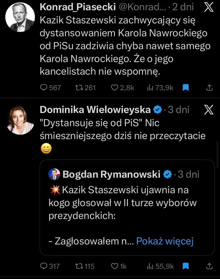– Opinie polityczne jakiegoś Kazika nie są istotniejsze ani ciekawsze od opinii jakiegokolwiek innego Kazia – napisał przyszły teść Taco Hemingwaya. W przypadku Piaseckiego i Wielowieyskiej zaskakiwać może podobieństwo ich spinu.