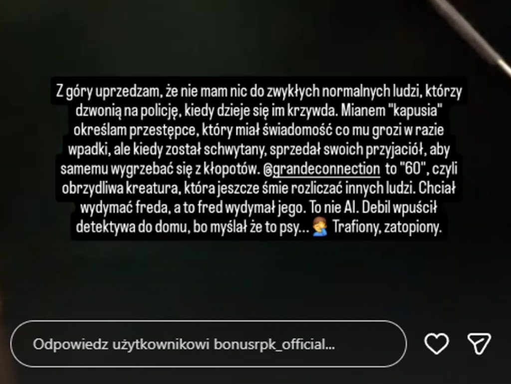 – Z góry uprzedzam, że nie mam nic do zwykłych normalnych ludzi, którzy dzwonią na policję, kiedy dzieje się im krzywda. Mianem „kapusia” określam przestępcę, który miał świadomość co mu grozi w razie wpadki, ale kiedy został schwytany, sprzedał swoich przyjaciół, aby samemu wygrzebać się z kłopotów. @grandeconnection to „60”, czyli obrzydliwa kreatura, która jeszcze śmie rozliczać innych ludzi. Chciał wydymać freda, a to fred wydymał jego. To nie AI. Debil wpuścił detektywa do domu, bo myślał że to psy… Trafiony, zatopiony – napisał Bonus RPK.