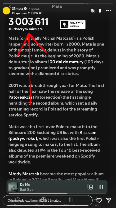 Mimo historycznego wyniku Mata nie wydaje się nadmiernie ekscytować liczbami. Na Instagramie udostępnił story z fragmentem kawałka „Ch*j w to” Spazmy, sygnalizując dystans do rekordów.