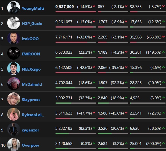 W 2025 roku Young Multi był bezdyskusyjnie numerem jeden na Twitchu w Polsce. Jego transmisje przyciągały średnio 11 577 widzów, co było najlepszym wynikiem w kraju. Równie mocno wygląda łączny czas oglądania – 9 927 809 godzin, czyli absolutny top na polskiej scenie streamingowej. Do tego dochodzi największy przyrost obserwujących w Polsce: 152 658 nowych follow w skali roku.