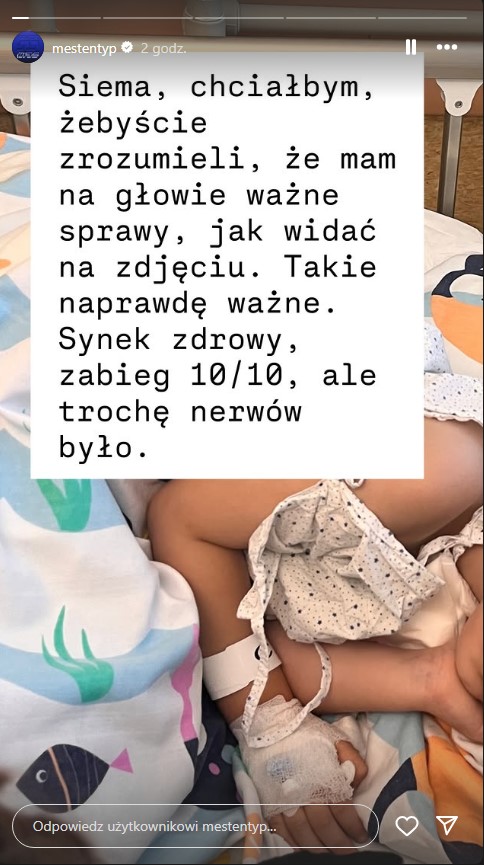 – Siema, chciałbym żebyście zrozumieli, że mam na głowie ważne sprawy, jak widać na zdjęciu. Takie naprawdę ważne. Synek zdrowy, zabieg 10/10, ale trochę nerwów było. Zupełnie nie ma dla mnie znaczenia, że komenteria mnie popędza, a resortowy jacuś poczuł, że wygrał, bo tak mu podpowiada lustro i stado giermków. Nie, nie wygrał. Nadal sepleni, kłamie i wypada z bitu. Nadal jest złym, wykorzystującym i oszukującym ludzi leszczem. Beef is on.”