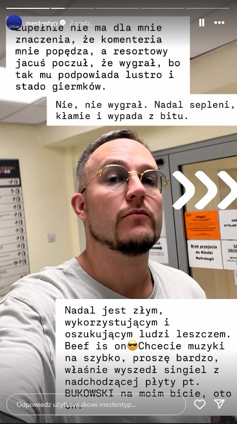 Mes wprost zaznaczył, że konflikt nie został zakończony i słuchacze mogą spodziewać się kolejnych ruchów z jego strony. Jak podkreślił, nowy singiel powstał na jego własnym bicie i stanowi zapowiedź nowej płyty „Bukowski”.