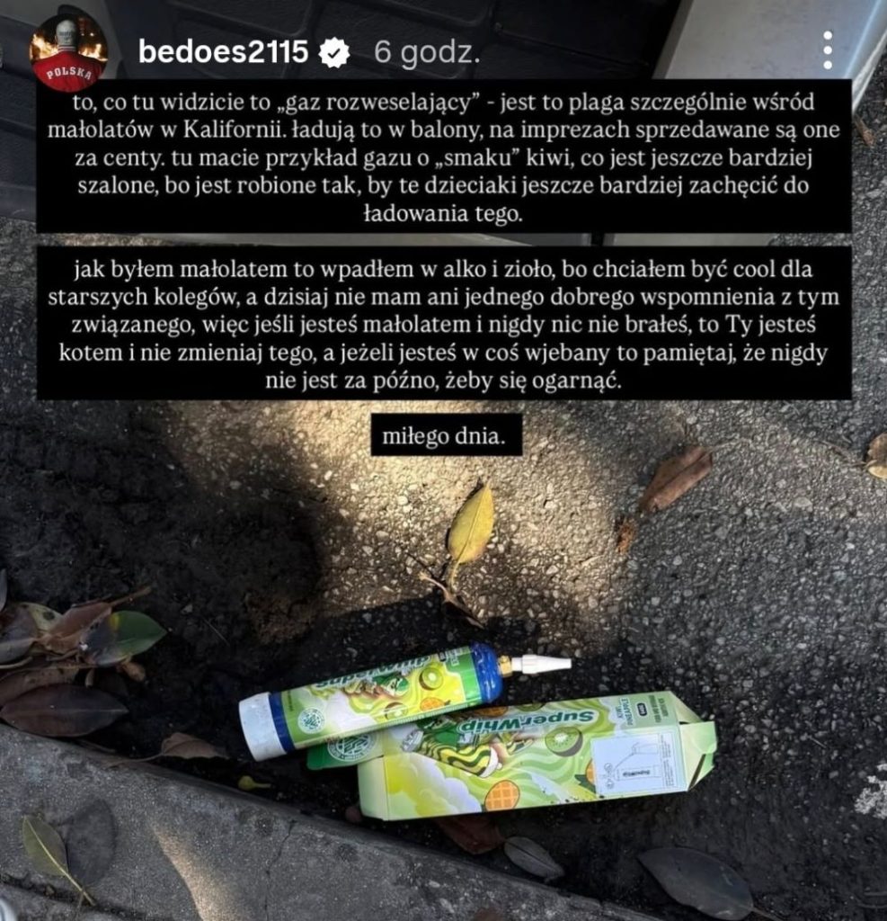 Bedoes zabrał głos w sprawie gazu rozweselającego, który coraz częściej służy młodzieży do odurzania się. Raper ostrzega przed modą na wdychanie podtlenku azotu.