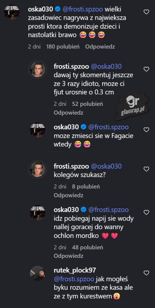 Najostrzej zareagował Oska030, który wdał się w dyskusję z Frostim. – Frosti wielki zasadowiec nagrywa z największą prosti, która demonizuje dzieci i nastolatki brawo – napisał.