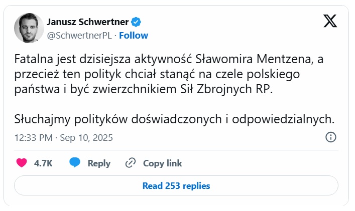 Zarówno na początku wojny, jak i dziś, praktycznie nie istnieje żadna debata publiczna na temat bezpieczeństwa Polski. Narzucono narrację, że „Ukraina de facto wygrała ten konflikt militarnie”, a my ogrzejemy się w blasku ich zwycięstwa jako kraj, który poświęcił się najbardziej ze wszystkich europejskich państw. Bardziej krytyczną ocenę sytuacji wyraził ostatnio Sławomir Mentzen. Polityk ostrzega konsekwentnie o skali rozbrojenia polskiej armii, jak również podkreśla, że zmarnowaliśmy ponad 3 lata na zabezpieczenie się przed ewentualnym atakiem Rosji. Jego pesymistyczna ocena nie spodobała się Schwertnerowi. Neobeckowiec nazwał mentzenową krytykę rządu „fatalną aktywnością”. Niedługo później dodał, że w jego ocenie „Konfederacja pilnuje rosyjskiej racji stanu”.