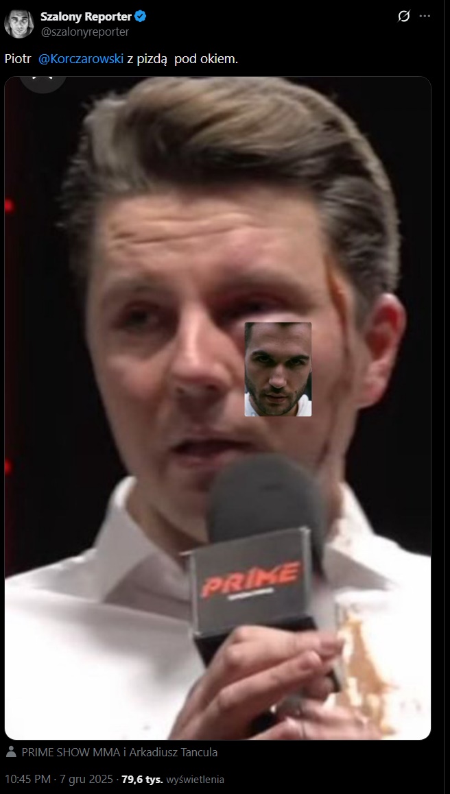 – Piotr Korczarowski z p*zdą pod okiem – napisał Szalony, umieszczając fotografię rapera pod okiem byłego polityka, który ucierpiał podczas konferencji Prime 15.