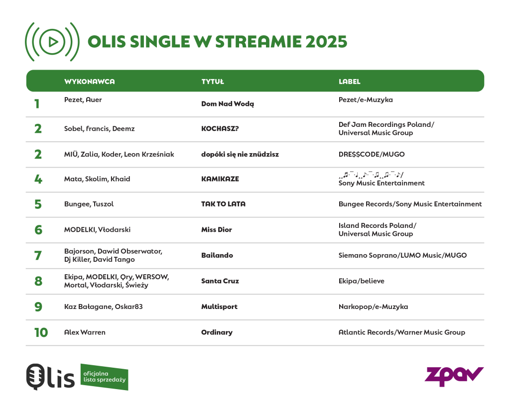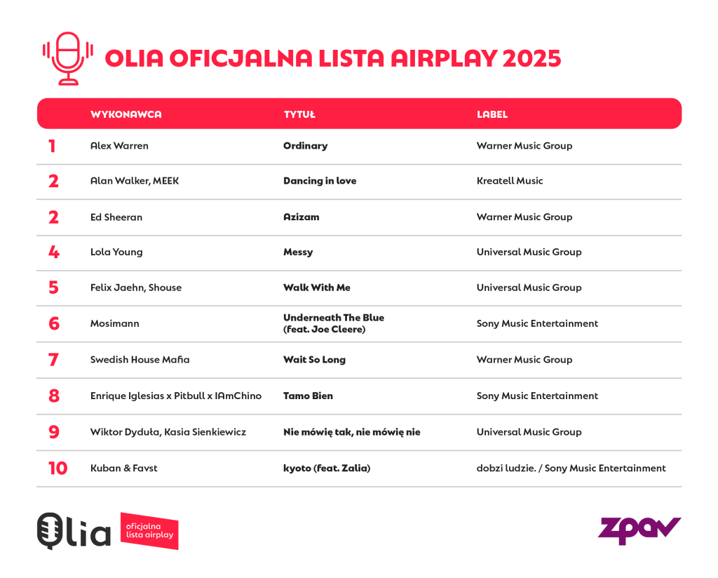Na tym tle odmiennie prezentuje się radiowy Airplay. Po skokowym wzroście udziału polskiej muzyki w setce najczęściej emitowanych utworów w 2024 roku – z 29. do 39. pozycji – miniony rok przyniósł korektę na niekorzyść krajowego repertuaru. Na Oficjalnej Liście Airplay (OLiA) w 2025 roku 38 pozycji w Top 100 zajmują polskie utwory, a w Top 10 znalazły się zaledwie dwa (cztery w 2024 roku). Co istotne, pierwszy krajowy utwór – Nie mówię tak, nie mówię nie Wiktora Dyduły i Kasi Sienkiewicz – pojawia się dopiero na 9. miejscu, podczas gdy ubiegłoroczne podsumowanie polskie utwory nie tylko zamykały na 9. i 10. lokacie, ale i otwierały, obejmując kolejno 1. i 2. pozycję.