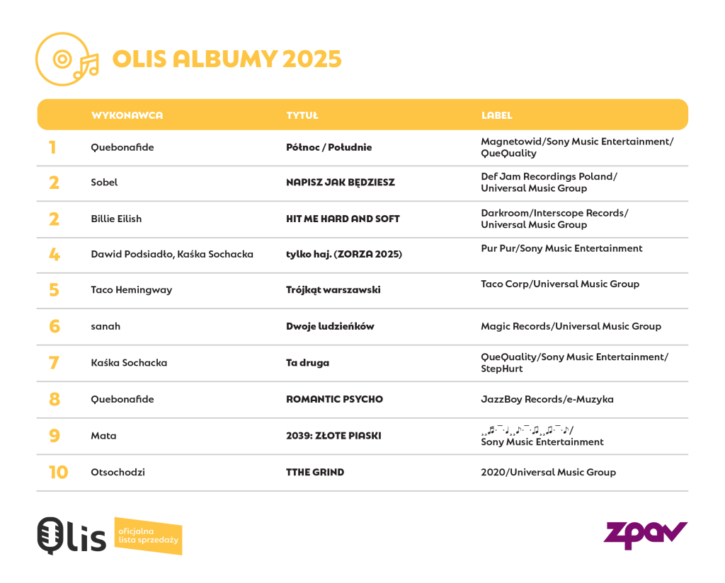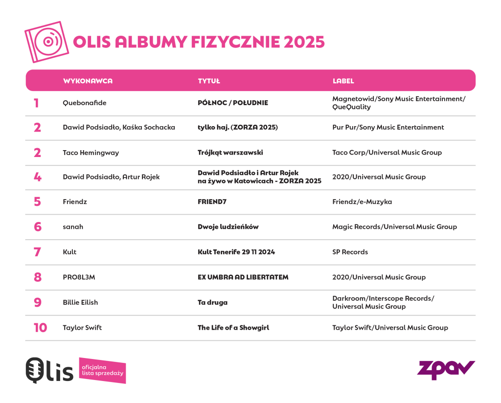 Najlepiej sprzedającym się albumem w formatach fizycznych w 2025 roku okazało się wydawnictwo Północ / Południe Quebonafide. Drugie miejsce zajmuje wspólny projekt Dawida Podsiadły i Kaśki Sochackiej: tylko haj. (Zorza 2025), natomiast trzecia pozycja należy do zremasterowanego albumu Trójkąt warszawski Taco Hemingwaya.