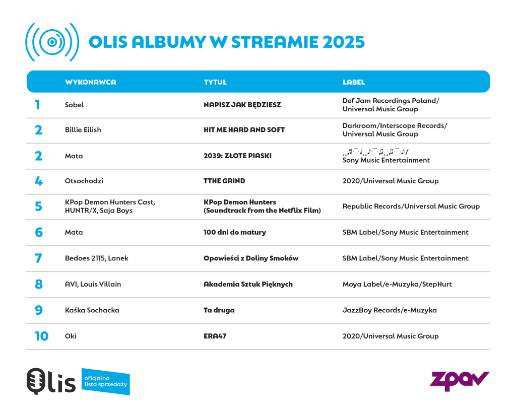 W Top 10 tylko dwa miejsca zajmują zagraniczne wydawnictwa: obok albumu Billie Eilish na 5. pozycji znalazła się ścieżka dźwiękowa KPop Demon Hunters. Łącznie w całym zestawieniu Top 100 uplasowało się 68 albumów polskich artystów.