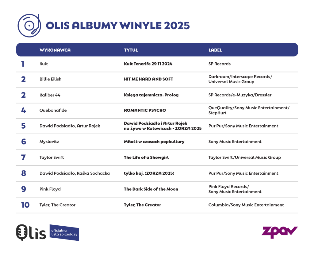 Na liście OLiS Winyle w 2025 roku dominują wydawnictwa spoza bieżącego kalendarza premier, w tym albumy klasyczne i wznowienia. Na pierwszym miejscu znalazła się koncertowa płyta Kult Tenerife 29 11 2024 zespołu Kult, drugą pozycję zajęło wydawnictwo Hit Me Hard and Soft Billie Eilish, a pierwszą trójkę zamyka kultowy album Księga tajemnicza. Prolog grupy Kaliber 44.
