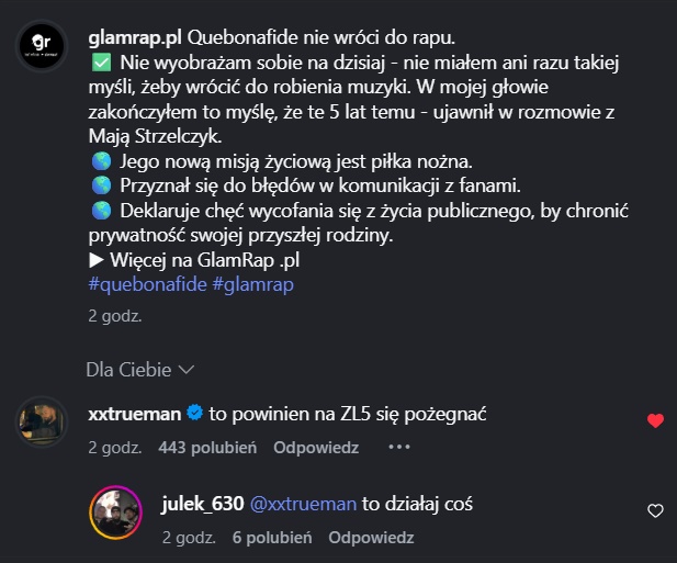 W środę wieczorem ukazał się wywiad z Quebonafide, w którym ten podał przyczyny odejścia od muzyki, opowiedział o błędach, które popełnił w komunikacji z fanami, a także ujawnił, że teraz jara się piłką nożną i to jego nowa misja życiowa.