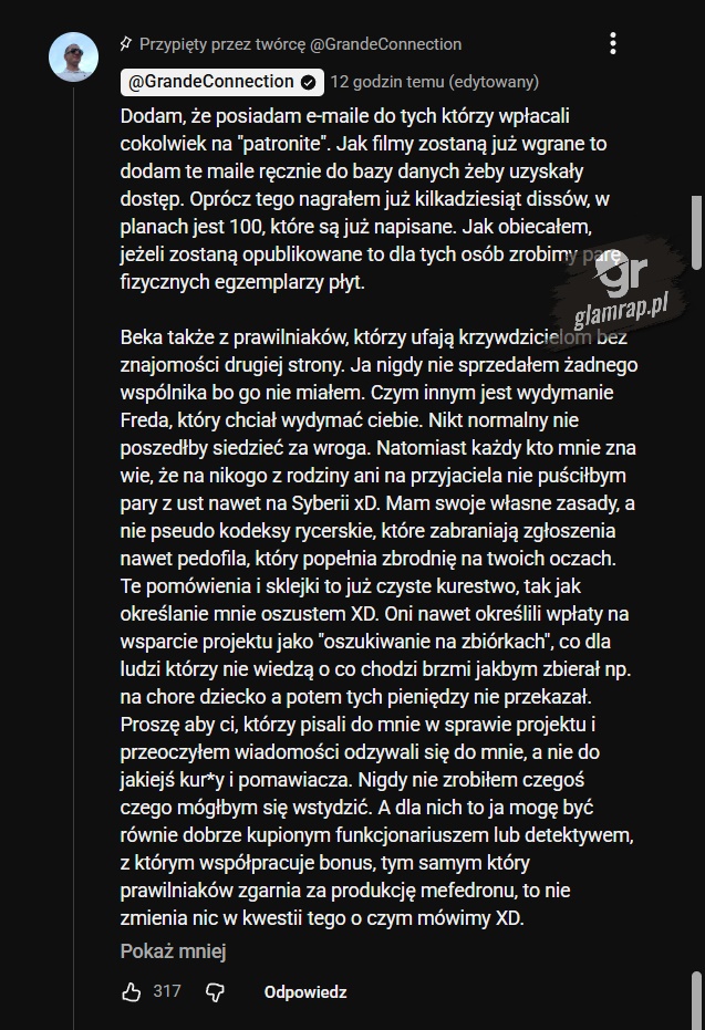 – Oni nawet określili wpłaty na wsparcie projektu jako „oszukiwanie na zbiórkach”, co dla ludzi którzy nie wiedzą o co chodzi brzmi jakbym zbierał np. na chore dziecko a potem tych pieniędzy nie przekazał. Proszę aby ci, którzy pisali do mnie w sprawie projektu i przeoczyłem wiadomości odzywali się do mnie, a nie do jakiejś kur*y i pomawiacza. Nigdy nie zrobiłem czegoś czego mógłbym się wstydzić. A dla nich to ja mogę być równie dobrze kupionym funkcjonariuszem lub detektywem, z którym współpracuje Bonus, tym samym który prawilniaków zgarnia za produkcję mefedronu, to nie zmienia nic w kwestii tego o czym mówimy – dodał.