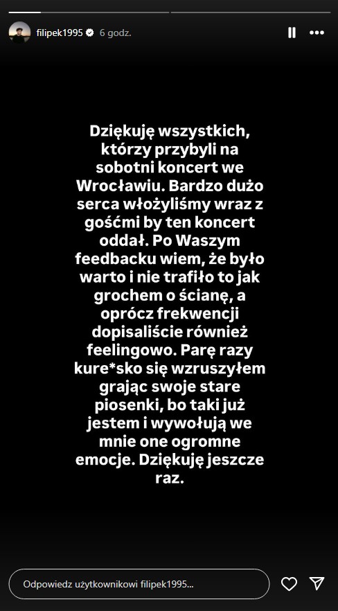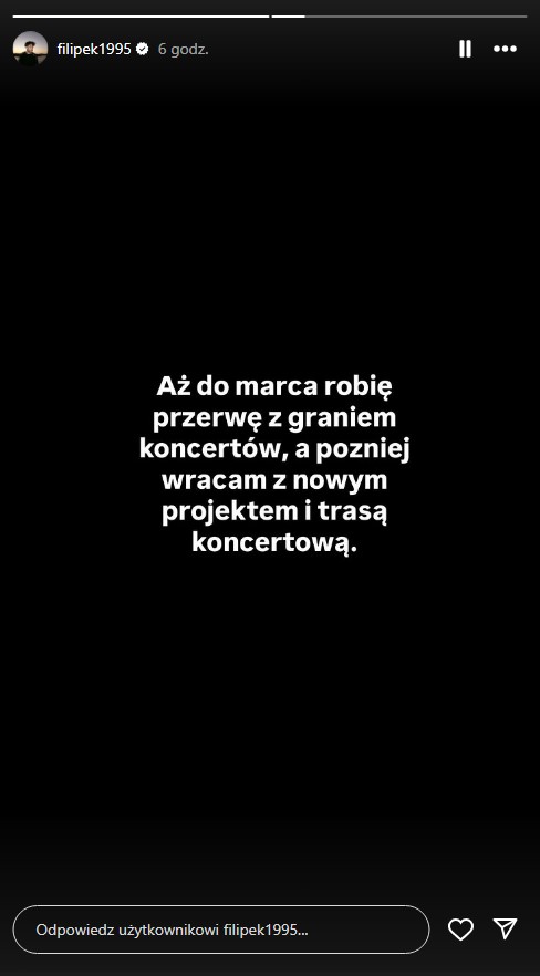 – Chciałem wrzucić numer na moje urodziny jak co roku to robię, ale bez ściemy zamuliłem bo nie miałem siły podnieść się z łóżka, a co dopiero coś tam klikać. Sorry, wrzucę na dniach, więc wyjdzie trochę później na Spotify, a na YouTube to zaraz mogę wrzucić w sumie – dajcie znać czy w ogóle chcecie. Muzyka to ostatnie co mi zostało, tak samo jak słuchacze. Jeszcze raz sorry za tak depresyjny post, ale jest jak jest, koniec z jakąkolwiek ściemą. 33 lata w dupę j*bane – dodał.