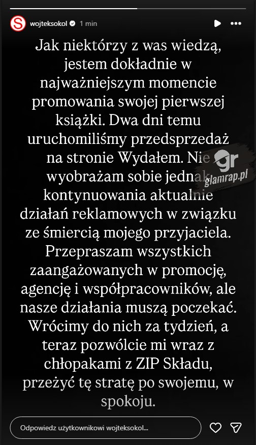 Sokół odkłada na później działania promocyjne związane z nową książką „Wesołych Świąt”. Wszystko przez wzgląd na śmierć Pono i szacunek dla przyjaciela.