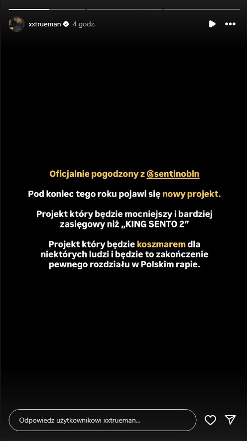– Oficjalnie pogodzony z Sentino. Pod koniec tego roku pojawi się nowy projekt. Projekt, który będzie mocniejszy i bardziej zasięgowy niż „King Sento 2”. Projekt, który będzie koszmarem dla niektórych ludzi i będzie to zakończenie pewnego rozdziału w polskim rapie – zapowiedział Trueman.