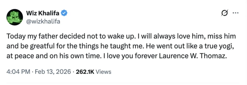 Wiz Khalifa pożegnał ojca za pośrednictwem platformy X. – Dzisiaj mój ojciec postanowił się nie obudzić. Zawsze będę go kochał, tęsknił za nim i będę wdzięczny za rzeczy, których mnie nauczył. Odszedł jak prawdziwy jogin – w spokoju i we własnym czasie. Kocham cię na zawsze, Laurence W. Thomaz – napisał raper.