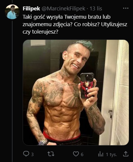 Filipek: Posłuchaj mnie parszywku. Nie będę tłumaczył Ci jakimś jesteś chwastem społecznym czy to, że Ty skomentowałeś mój post. Tak samo nie będę wyzywał się na Twoich rodzicach czy biednej żonie, którą zdradzasz po afterach.