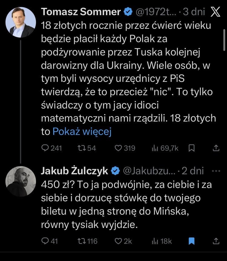 Jakub Żulczyk dał się ostatnio poznać jako gorący zwolennik polityki Unii Europejskiej i finansowego utrzymywania Ukrainy. Według pisarza ciężar prowadzenia wojny powinni ponosić Polacy, choć pytaniem otwartym jest, dlaczego nie mieliby tego robić np. ukraińscy miliarderzy, których nawet nie próbowano objąć podatkiem wojennym? Żulczyk pocisnął m.in. z Mentzenem, Skalikiem, a ludzi, którzy mieli odmienny światopogląd odsyłał do Mińska.